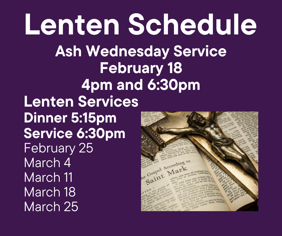 Lenten Schedule(2/3/2026)-On Wednesday, February 18th, we will have the imposition of ashes during the service. There will also be a meal hosted by our women’s group at 5:15pm.